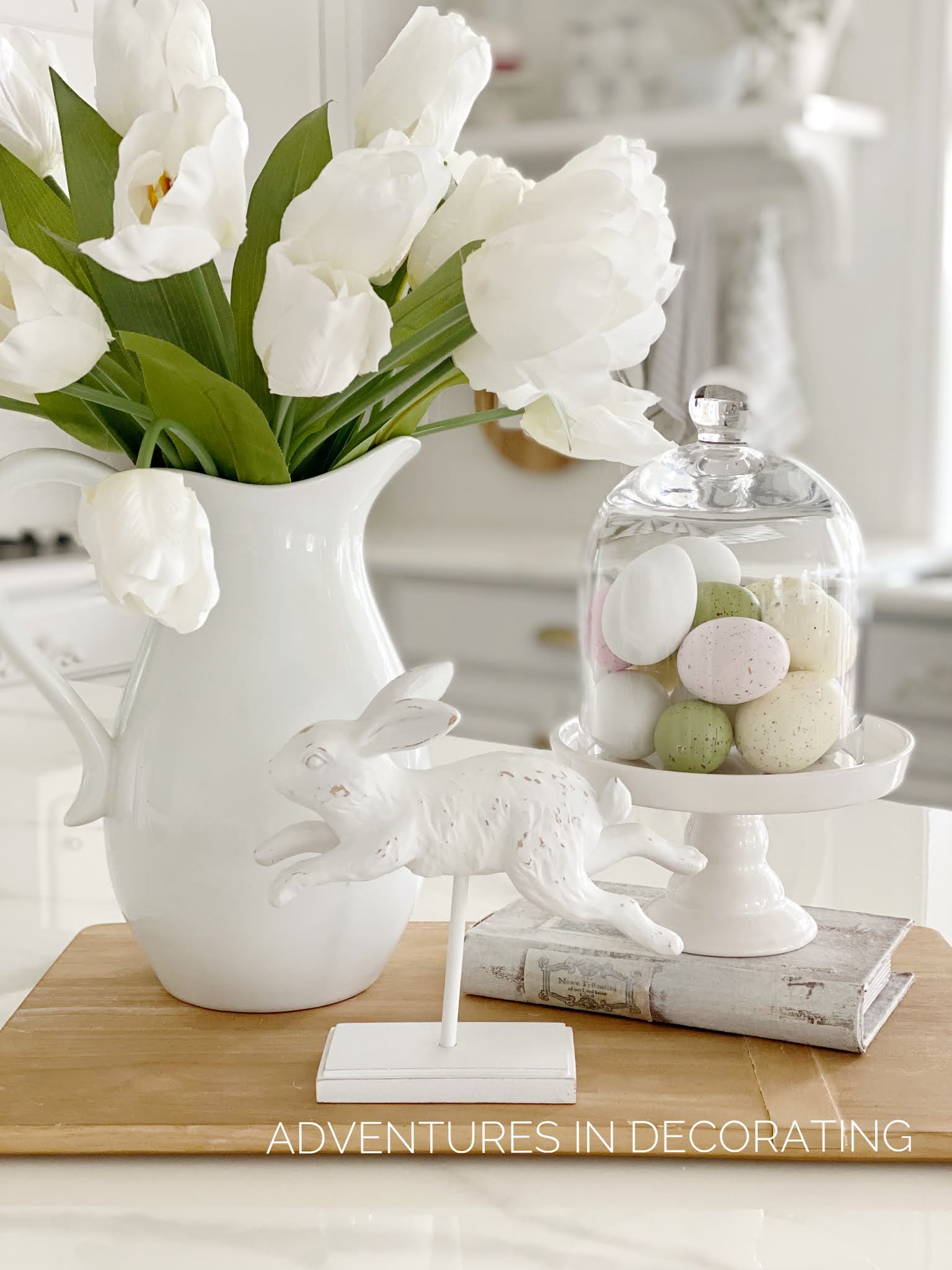 Back on the island, I styled this simple vignette to welcome the new season ... bunnies are a fun and easy decorating staple this time of year, wouldn't ya' say?