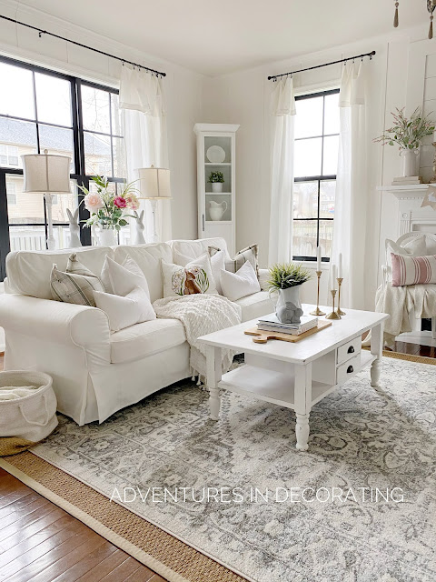Now, let's walk on into our great room, where I've continued the blush, green and white Spring theme. Of course, a pillow refresh was in order for the new season, too.