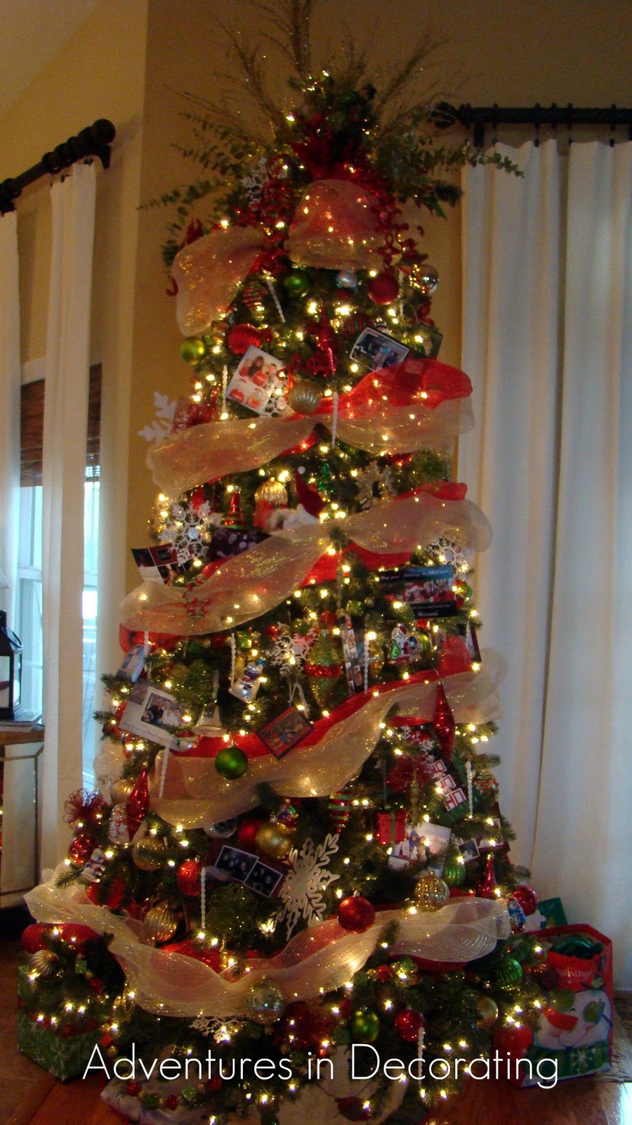 This tree used to be in our kitchen  during the Fall ... it was our Fall Family Tree.  My sweet husband and I carefully dragged it to its new spot ... removed the Fall leaves and brown ornaments and replaced them with Chistmas pretties!