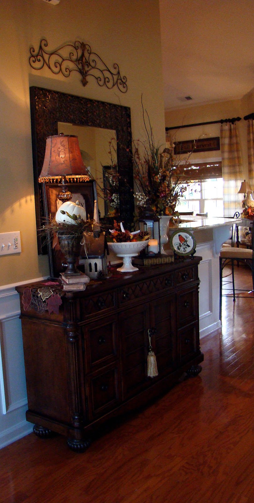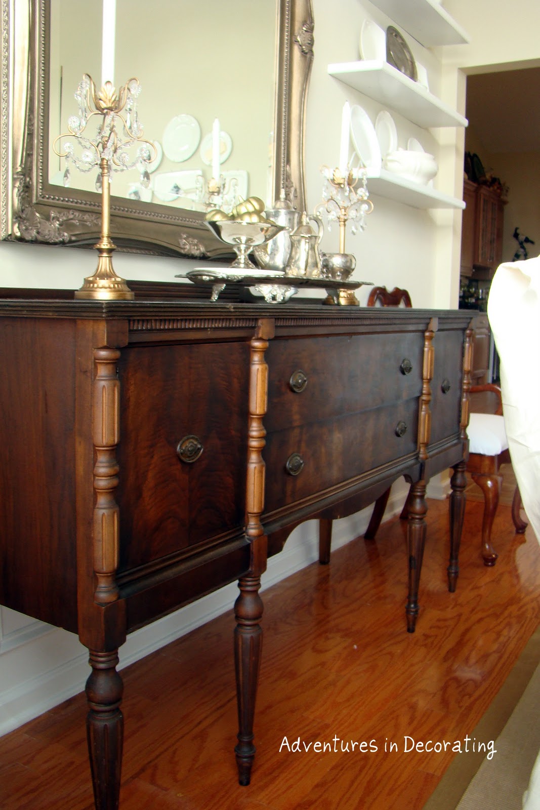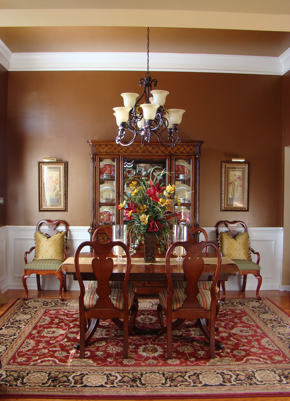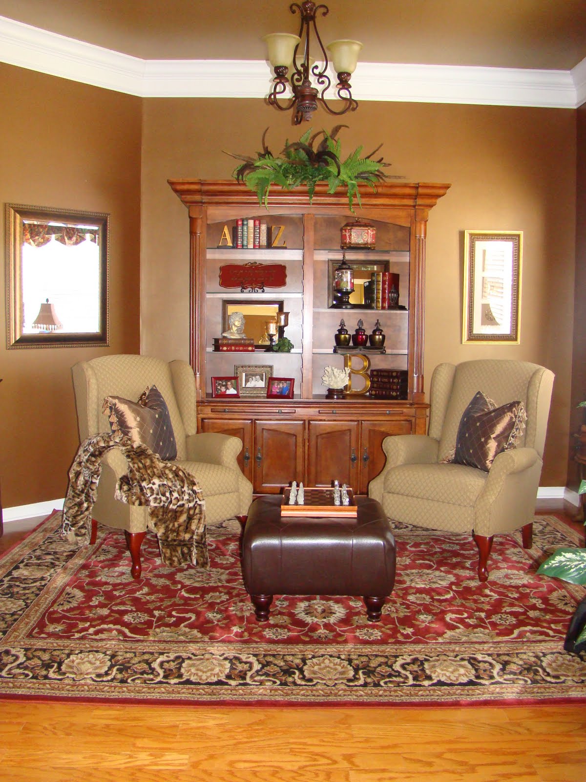 BEFORE: The walls were painted RL Metallic Paint/Lush Brown ... area rug in red/black and traditional hutch buffet: