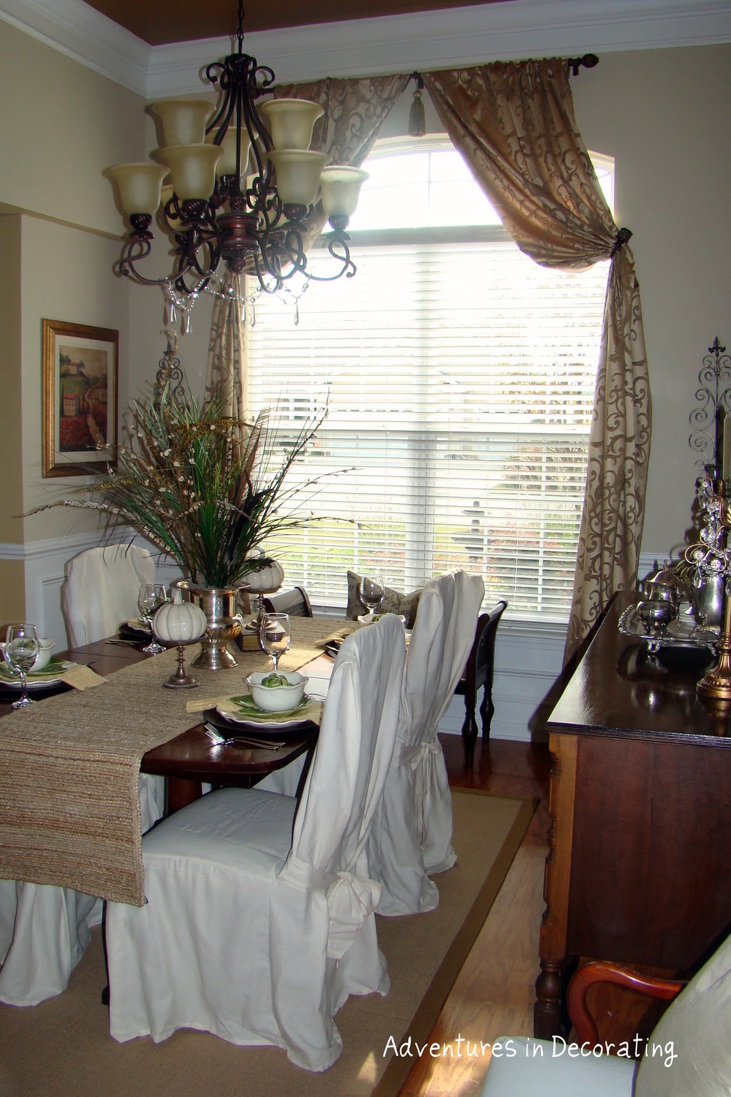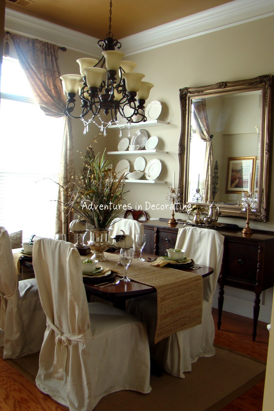 NOW: Yes, this is the same room, I promise! (Please go easy on me.) The walls are now BM Manchester Tan ... smaller sisal rug ... hutch buffet replaced by antique sideboard and one *ha-uge* mirror, and I slipcovered the side chairs in cotton duck slipcovers: