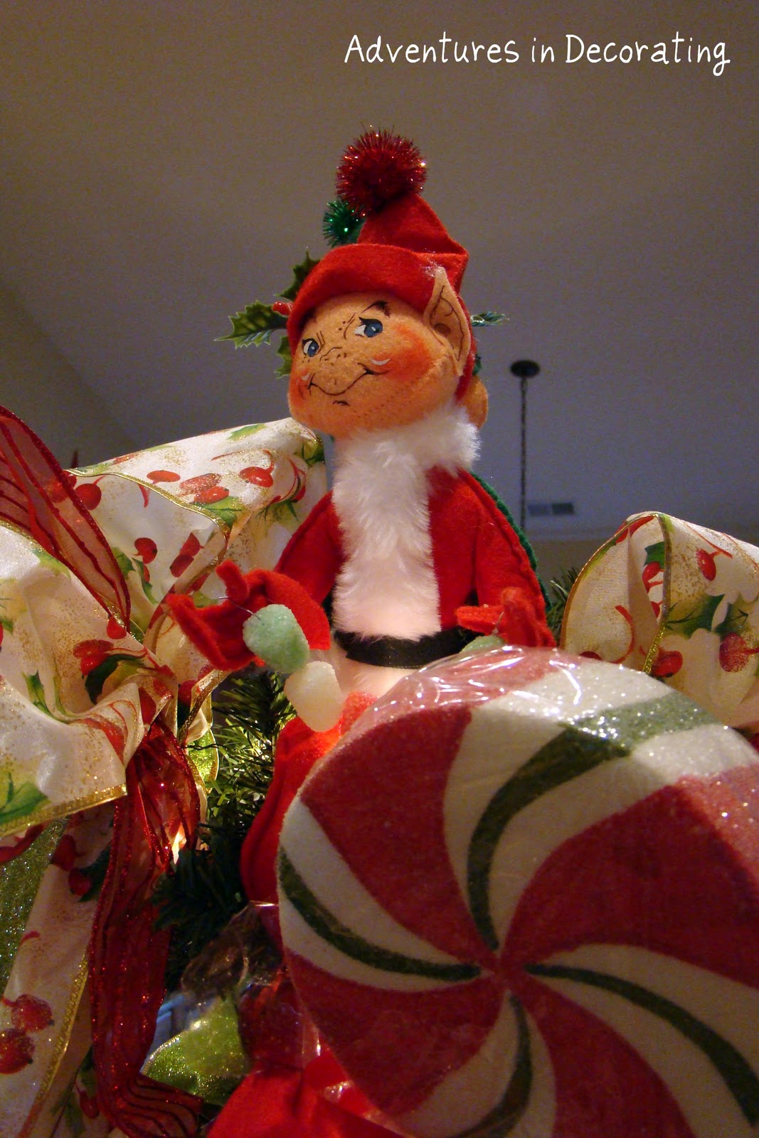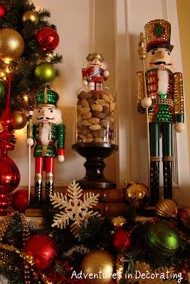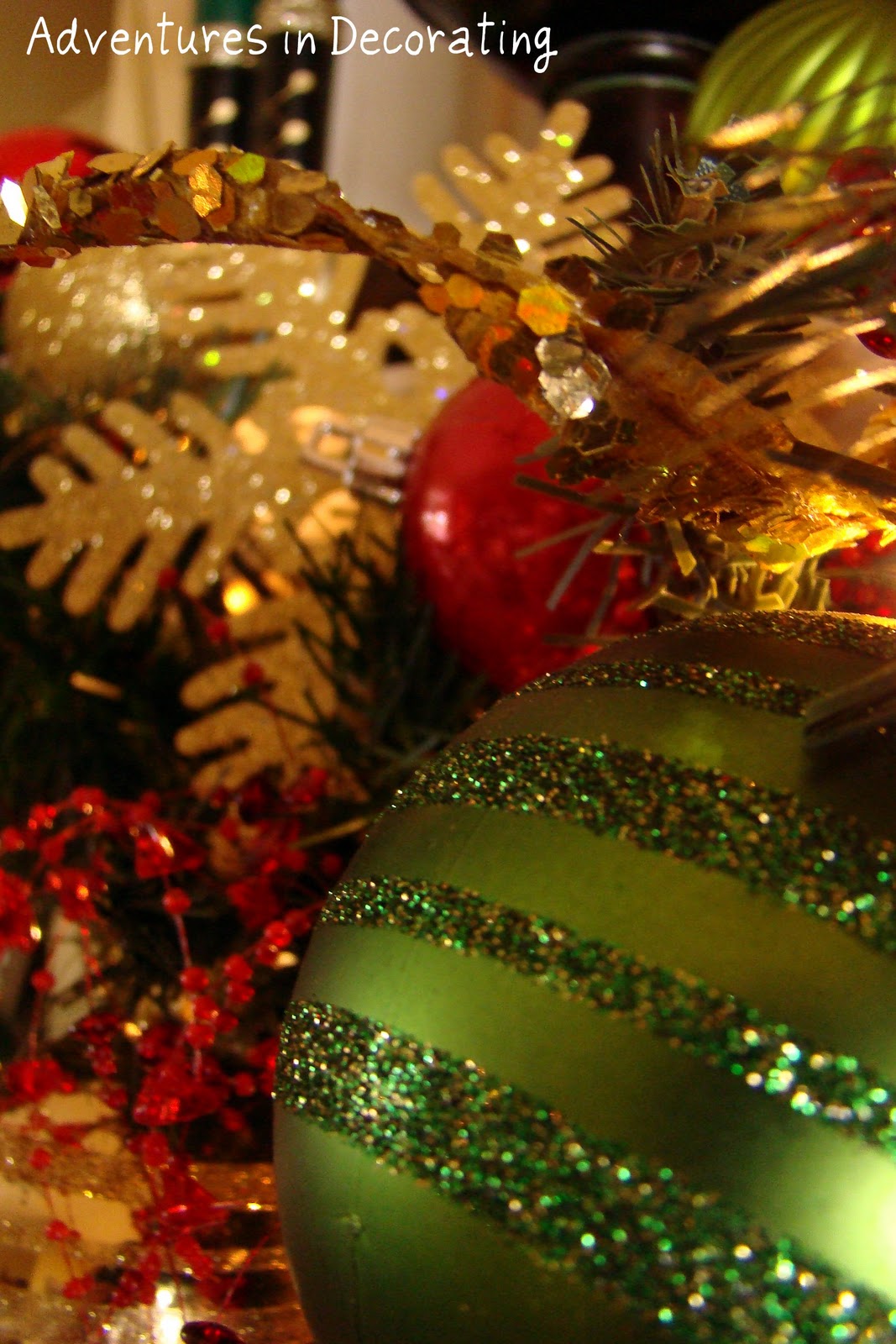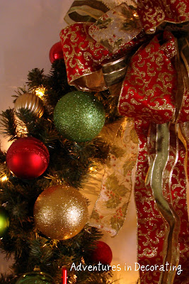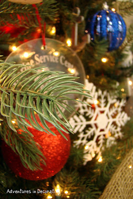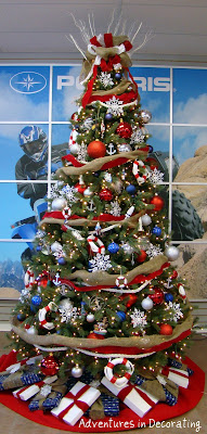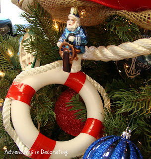 While I don't have a picture of what it looked like last year, it was done in a nautical look with red, blue and gold ornaments. The owners wanted it to still coastal/nautical feel as it did last year, but to change it up a bit. Sooo, I traded out their gold ornaments for silver ... added more blue and red and white ornaments and hoped for the best: