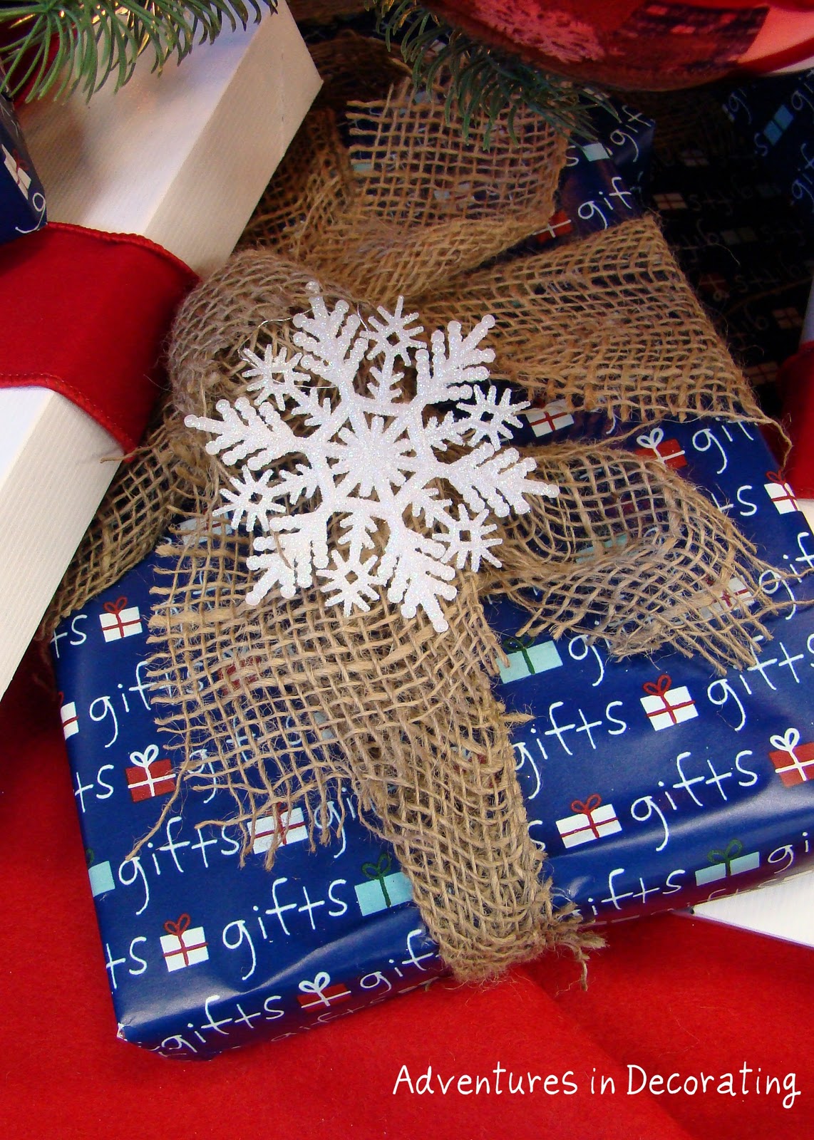 I wrapped the presents in coordinating blue background paper and chose burlap for the ribbon/bows, adding a snowflake on a few packages to tie in with the tree. I also added plain white boxes (with red ribbon) as well for contrast:
