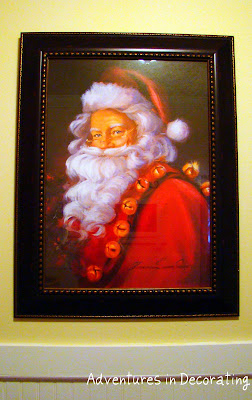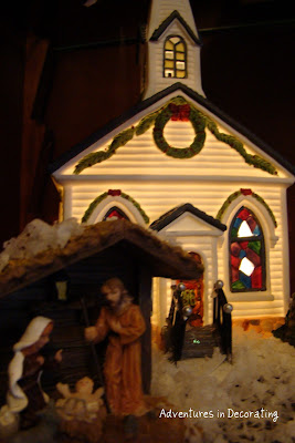 When you peek out the kitchen windows, you can catch a glimpse of our screened in porch where I put our rustic Santa, birdhouse and lanterns on top of the fireplace. I love sitting out there by the fire when it's chilly! We've talked about enclosing this space, but, with the real estate market being the way that it is, we really don't want to put any more money into our home that we may not get back whenever we sell: