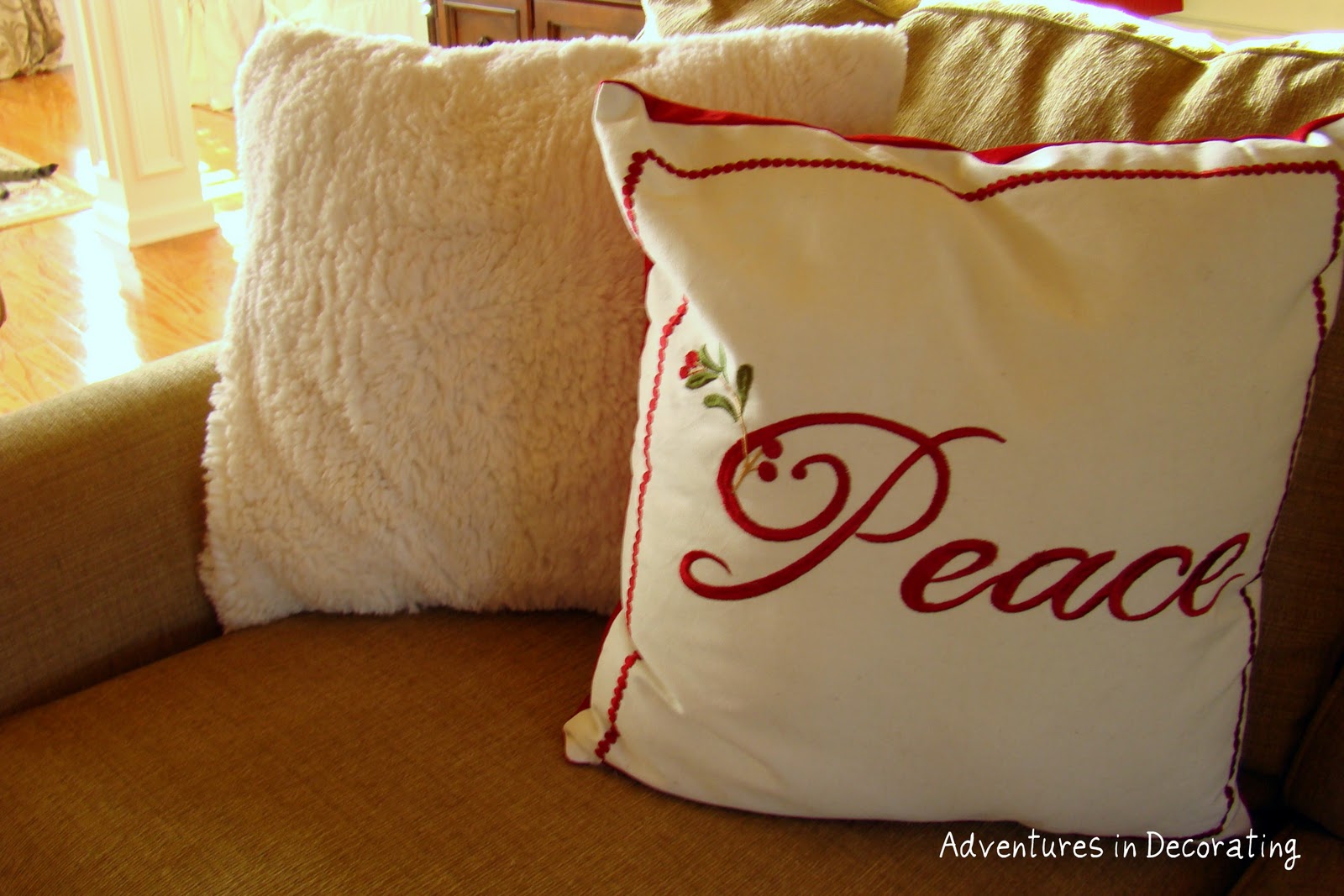 Back into the kitchen, here's our breakfast area. I placed simple wreaths on the windows and painted over the Fall saying (that used to be above the windows) with chalkboard paint and added a Christmas wish. On the table, I scrunched up a red blanket from Wal-Mart, along with a wreath around a hurricane: