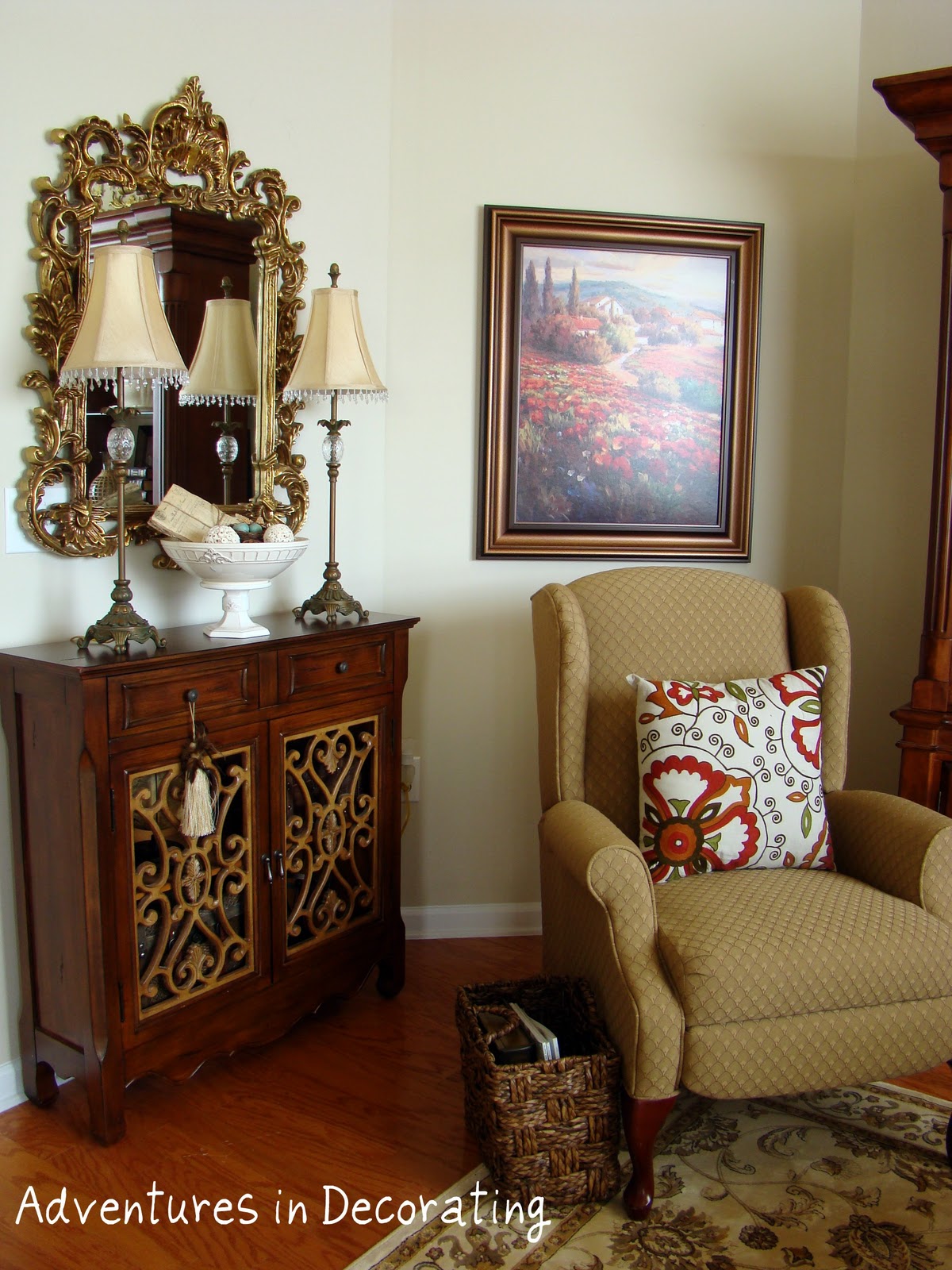 I moved one of my patterned rugs back in here, along with a wing chair, and brought in colorful pillows from World Market. The narrow accent table against the wall (from Kirkland's) holds a pair of lamps and a cream pedastal bowl, all from Home Goods: