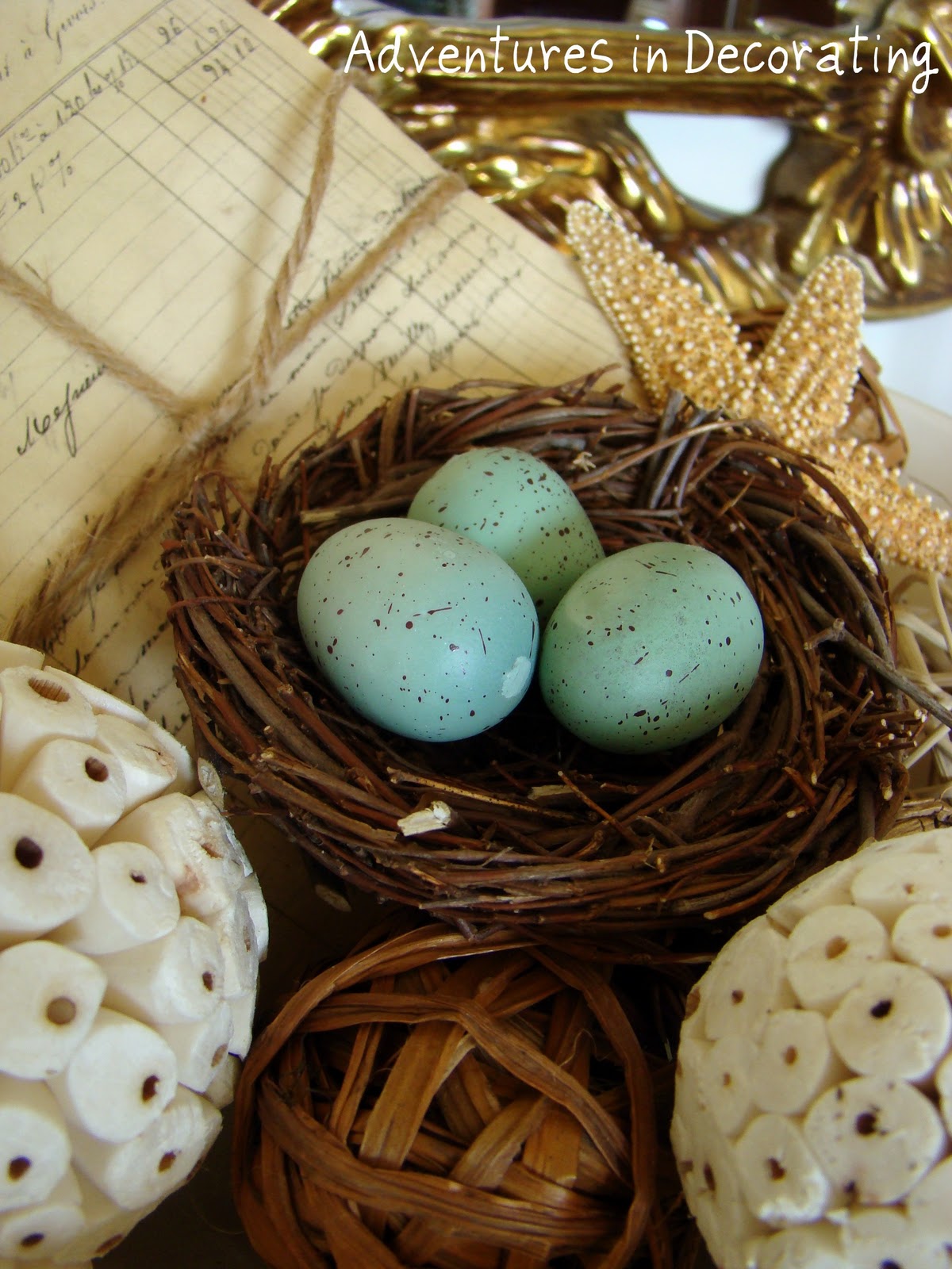 I filled the bowl with orbs, sea shells, a bound stack of pages from an old book and a cute nest filled with robin's eggs (from Pottery Barn):