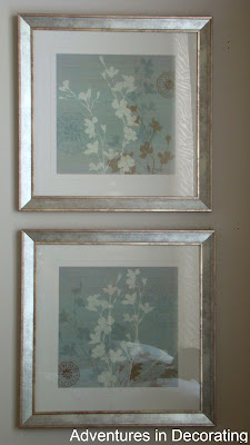 Because of the soft splashes of blue in the wallpaper, I thought I'd add more blue accents, so I brought this table in from my master bath.  I then added leftover zebra fabric to the lampshade and painted the once gold vintage mirror BM White Dove: