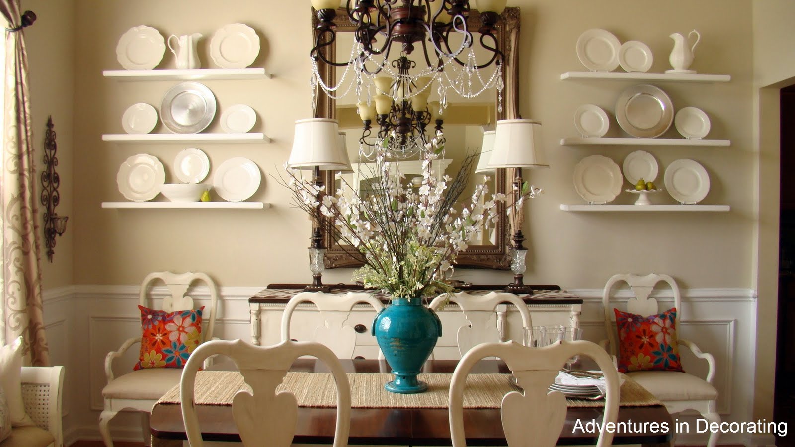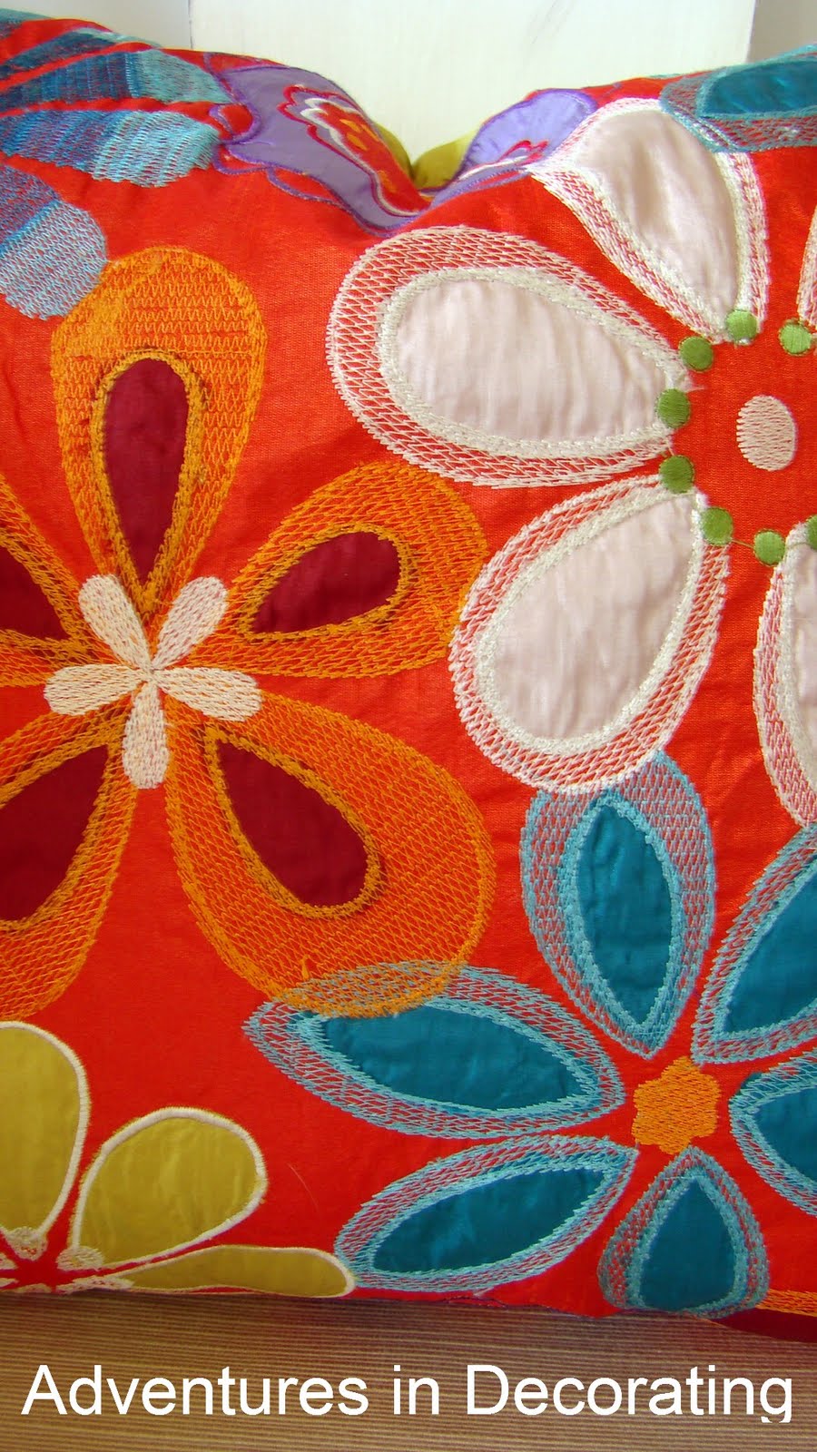 Not only did I paint all of the chairs, but I recovered them as well. And, for the arm chairs flanking the sideboard, I found these pillows at Pier One (on SALE) ... they simply screamed at me to take them home to add whimsical pops of color: