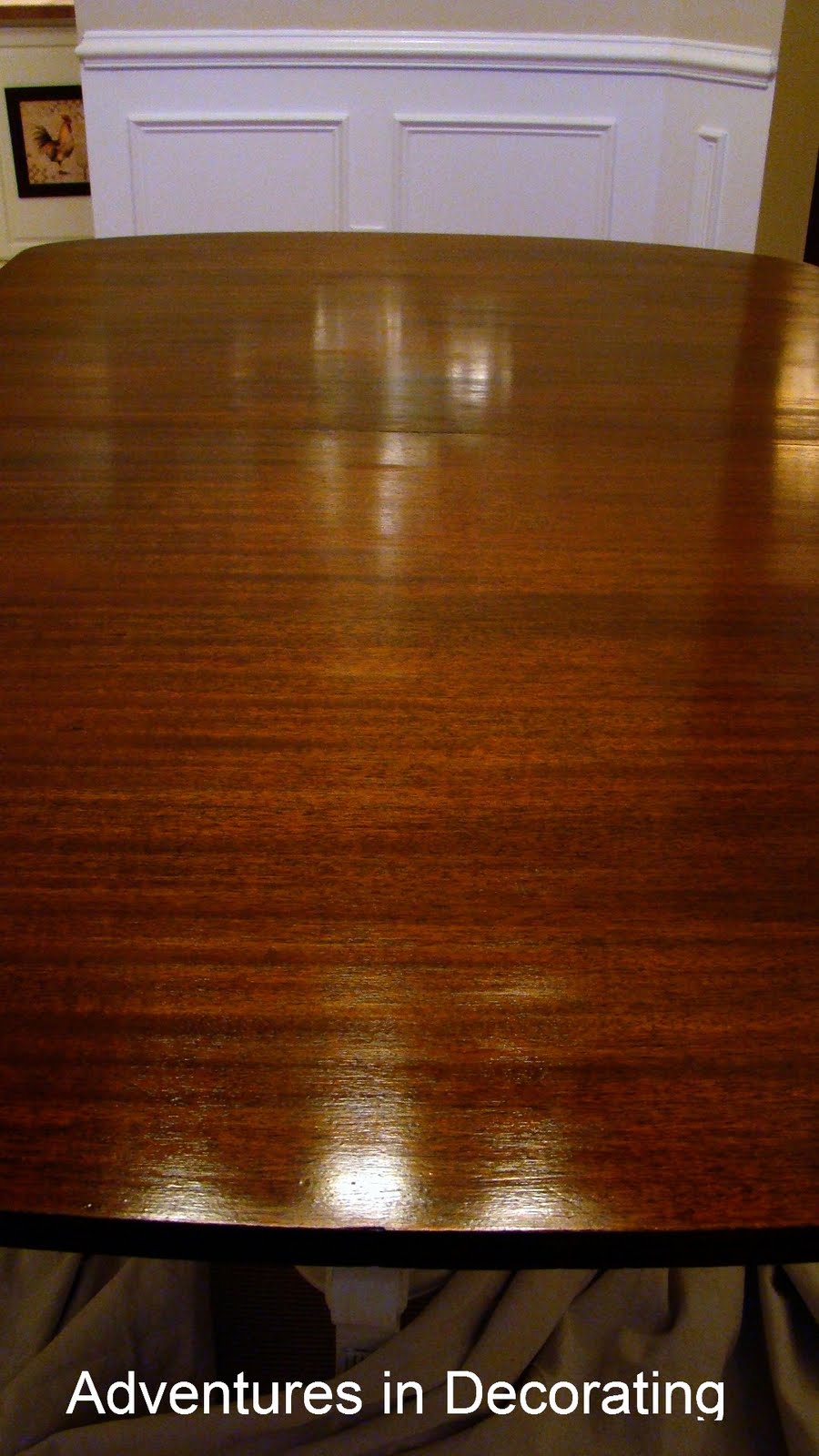 I LOVE how the tabletop gleams now that I refinished it (from a cherry stain to dark walnut to match the top of the sideboard):