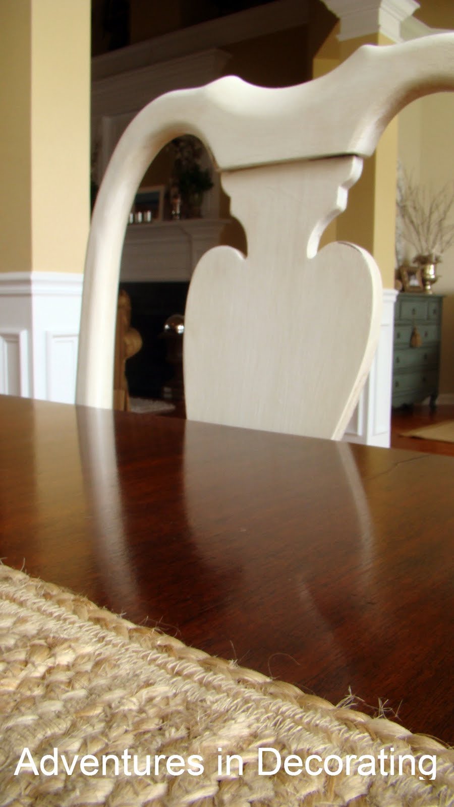 Here are the results of a crazy decorator (a/k/a ME) who was determined to give her dining room a new look by painting every.single.piece of furniture (all dark stained) BM White Dove, followed by sanding, staining and waxing!